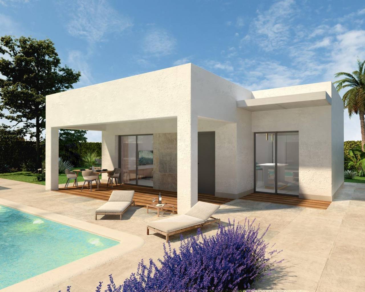 New Build Villas in La Montañosa Urbanization, Hondón de las Nieves Peaceful Mediterranean Living in Alicante Countryside Discover an exclusive collection of new build villas located in La Montañosa, a quiet residential area near the charming village of Hondón de las Nieves. Known for its traditional Spanish atmosphere, beautiful mountain scenery and relaxed lifestyle, this inland location offers the ideal balance between tranquility and convenience. Enjoy a rural setting surrounded by nature while being only 30 km from the beaches of the Costa Blanca and vibrant coastal towns. Customizable Single Level Villas with Modern Comfort This residential project offers customizable villas designed on one floor for maximum comfort and easy living. Choose from different architectural styles, including ibicenco, modern and Mediterranean designs, all featuring 3 bedrooms and 2 bathrooms, one of them en suite. Built sizes range between 100 and 125 square meters, with spacious open plan living areas, furnished kitchens, fitted wardrobes and large windows that fill the home with natural light. Each villa is built on private plots starting from 400 square meters, giving you space, privacy and the opportunity to enjoy outdoor living in a peaceful environment. The final price depends on the villa model, construction system and selected plot. This reference price includes a plot valued at 82,500 euros, with adjustments made if a different plot is chosen. Outdoor Spaces Designed for Relaxation Enjoy the Mediterranean lifestyle with private gardens, a 6 x 3 meter swimming pool, a covered porch and private parking inside the plot. All plots are fenced, offering privacy and security. Whether you want to relax by the pool, enjoy mountain views or entertain guests, these villas provide an exceptional outdoor experience. High Quality Construction and Modern Features Delivered approximately 12 months after license approval, each villa is built to high standards with premium features including: Armored entrance door and motorized vehicle gate Motorized shutters in bedrooms Fully furnished kitchen Fully equipped bathrooms with vanity units, mirrors and shower screens Pre installation for ducted air conditioning Aerothermal hot water system Ideal Location Close to Nature and Key Attractions Alicante Airport: 35 km Beaches of Costa Blanca: 30 km Alicante City and Port: 40 km Elche: 28 km Alenda Golf: 20 km Font del Llop Golf: 25 km Your New Mediterranean Home Awaits Enjoy peace, privacy and modern living in one of Alicante inland's most beautiful residential areas. Contact us today to receive more information or arrange a viewing of these stunning new build villas in Hondón de las Nieves.